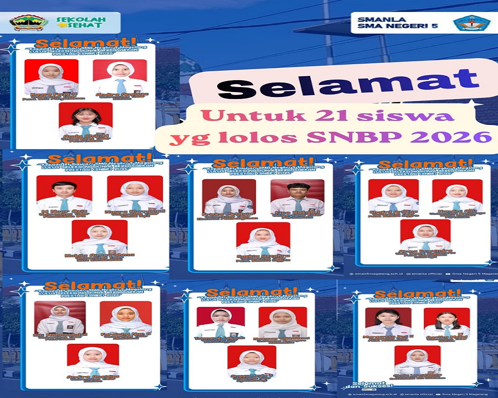Sebanyak 21 siswa kelas XII SMA N 5 Magelang berhasil lolos Seleksi Nasional Berdasarkan Prestasi (SNBP) 2026. Keberhasilan ini menjadi kebanggaan tersendiri bagi sekolah, guru, serta orang tua yang t